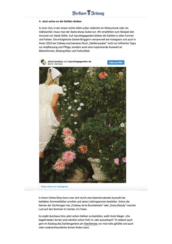 Habe gerade wieder bei dir bestellt, liebe Sarah, und freue mich schon riesig auf Januar, um neue Dahlien zu bestellen. Dieses Jahr war ich so begeistert von deinen Dahlien – echte Dauerblüher! Danke für die tolle Auswahl in deinem Shop.