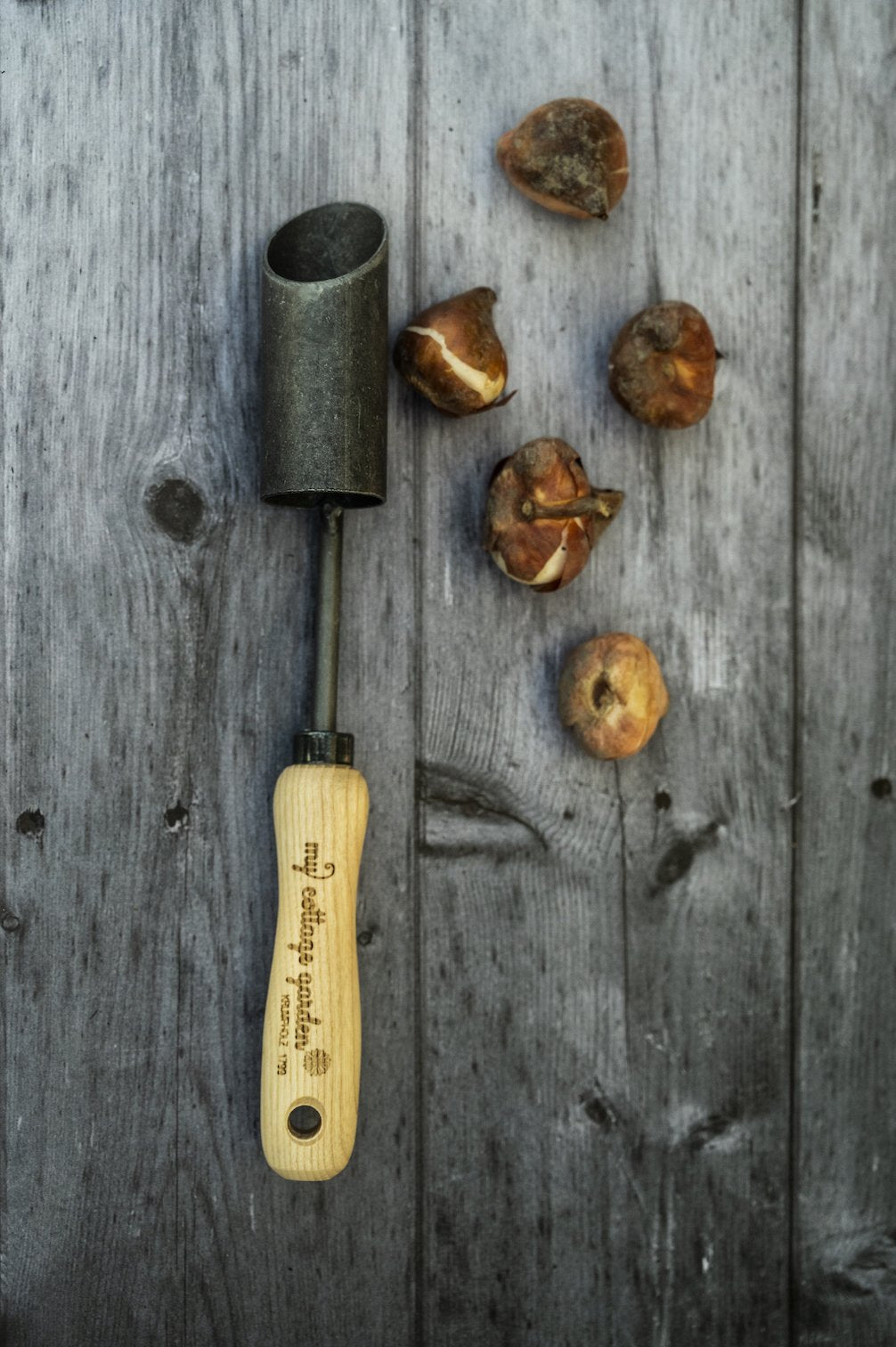 Mit diesem Werkzeug stanze ich im Herbst die Pflanzlöcher für Unmengen an Tulpen- und Narzissenzwiebeln in den Boden.