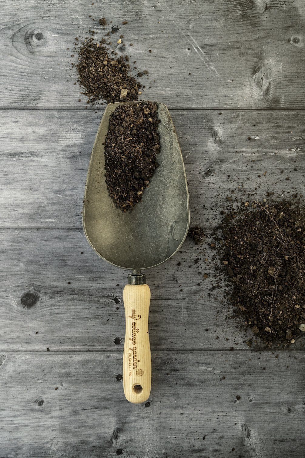 Mit der Kompostschaufel kannst Du bestens Deine Töpfe (auch mit normaler Erde) befüllen und den Kompost um die Pflanzen verteilen.