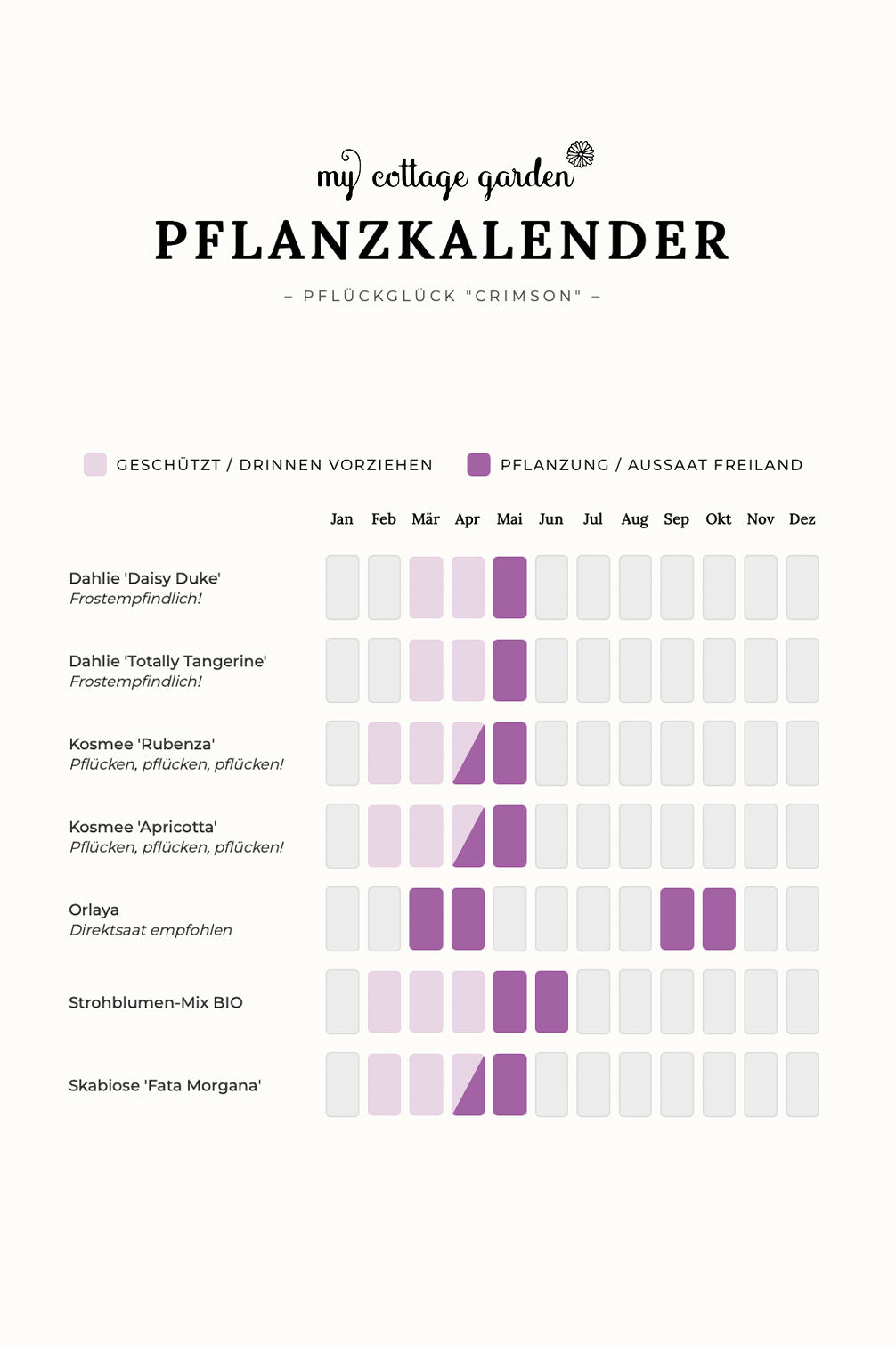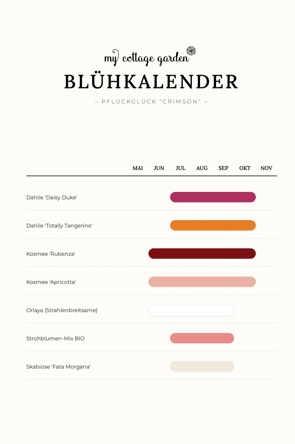 - 1x Saatgut Kosmee ‚Apricotta‘: Zarte Pfirsichnuancen, die einen wunderbaren Kontrast zum tiefen Rot bilden.